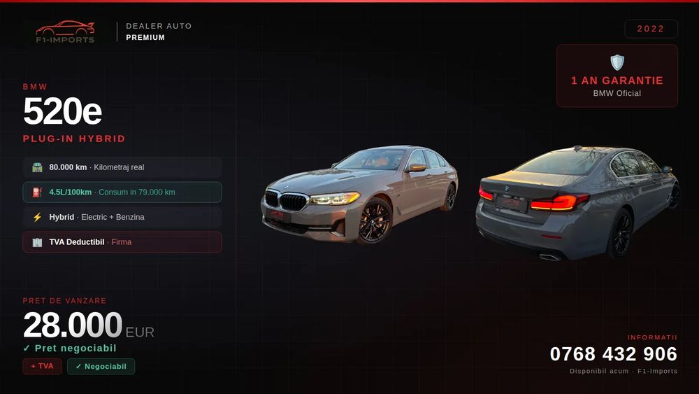 1998 cm3 • 204 CP • BMW 520e 2022 · TVA Deductibil · 1 An Garantie BMW · 4.5L/100km Real