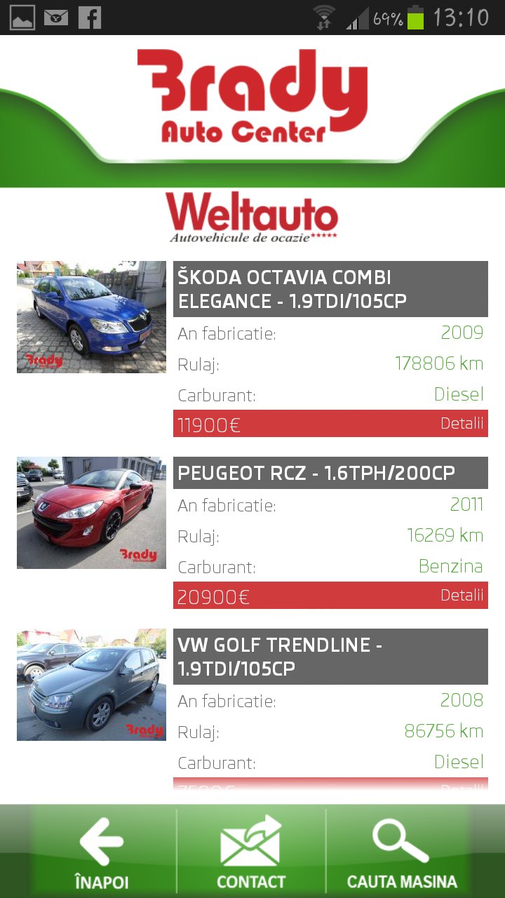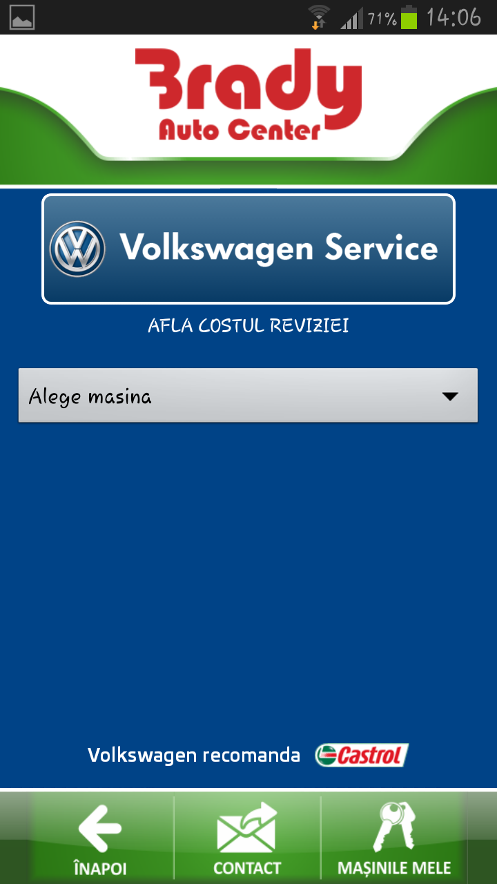 Aplicatia iti asigura o programare rapida la Service Brady, iti face un calcul estimativ al reviziei auto Skoda si Volkswagen, iti prezinta cele mai noi modele Skoda lansate pe piata din Romania dar si alternativa unor masini de ocazie cu garantie das WeltAuto.